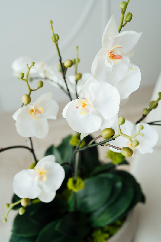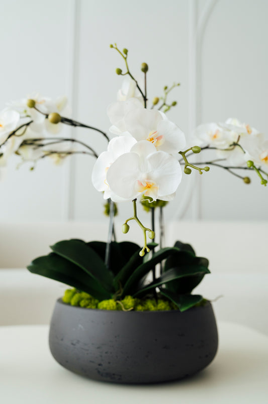 White Orchids in Dark Gray Cement Vase