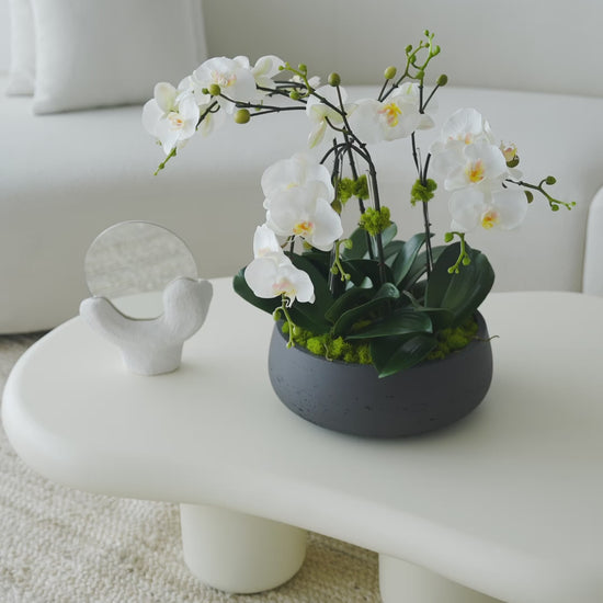 This arrangement features white silk orchids with delicate buds, placed in a contemporary dark-gray bowl with lush green moss and foliage at the base. The contrast between the light flowers and dark planter creates a striking, modern centerpiece that adds elegance to any room.